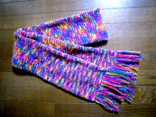 職業がお堅いサラリーマンではないし、客先もハンズやロフトだし、一応デザイナーの仕事だし、こんな派手なマフラーでもいいんでしょうね。